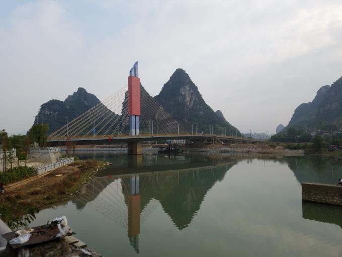 贺州市灵峰大桥工程位于八步区贺江一桥下游0.9公里处,北岸接灵峰北路,是连接贺江两岸、缓解城市交通压力、方便居民的重要通道之一。灵峰大桥设计全长为465.018米,其中南引道长50.448米,北引道长80.570米,引道全长131.018米,桥梁长度为334米,桥面宽度27米,按双向四车道设计。主桥采用独塔单索面预应力混凝土展翅箱梁斜拉桥,边跨跨径68米,主跨跨径86米,全长154米。桥面以上塔高51米,全桥设计共有77根桩基、9个承台、7个墩身、2个桥台。