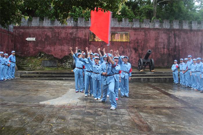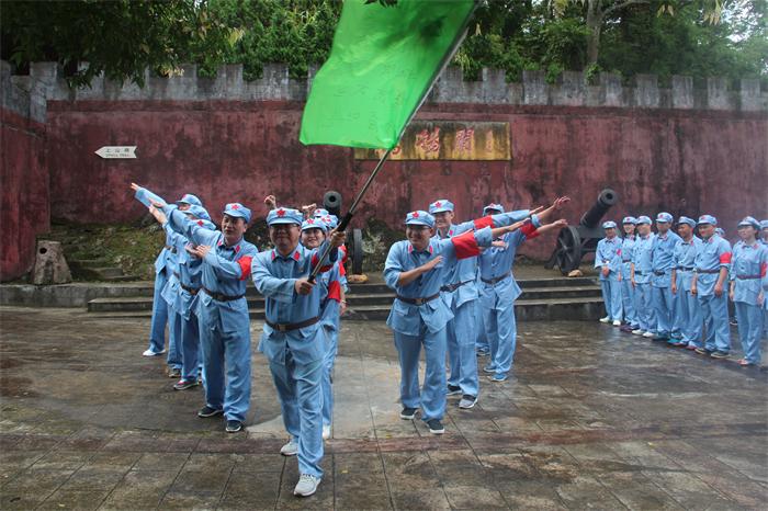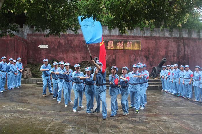 “七一”前夕,城投集团全体党员身穿红军装,头戴红军帽,腰系红军带,分乘两部大巴,雄赳赳气昂昂前往鹰扬关。