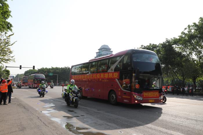 下午16点整,载着贺州支援湖北医疗队的大巴车在33辆摩托车铁骑、两辆警车的引导护航下驶入贺州大道,警灯闪烁、警笛嘹亮,沿途市民挥舞国旗,夹道欢迎,高声欢呼,寿城人民用最高礼遇,最深敬意,迎接英雄凯旋,表达对英雄的敬意。