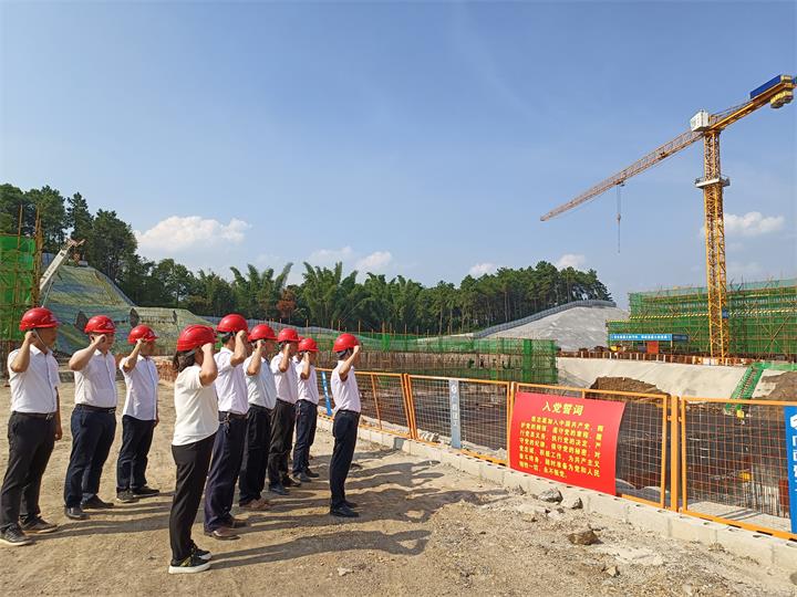 “我志愿加入中国共产党,拥护党的纲领,遵守党的章程,履行党员义务,执行党的决定……”项目建设施工现场,党员们面对庄严的党旗,重温了入党誓词。