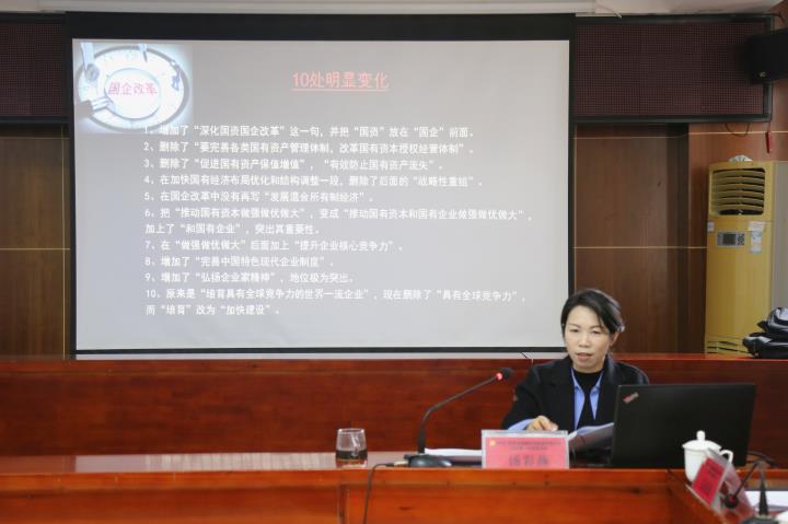 汤彩燕围绕党的二十大报告关于国企改革的重要论述和部署进行系统宣讲,深入解读了党的二十大报告对国企改革提法上的变化以及二十大报告标志了国企改革的八大趋势等内容。她表示,习近平总书记在党的二十大报告中,对深化国资国企改革作出了新的重大部署,对于国资国企改革的时代背景、方向、使命任务、目标、途径、要求做出表述,有清晰的时代感与厚重的实在感,为全面建设社会主义国家新征程国有企业改革指明了方向、提供了根本遵循。